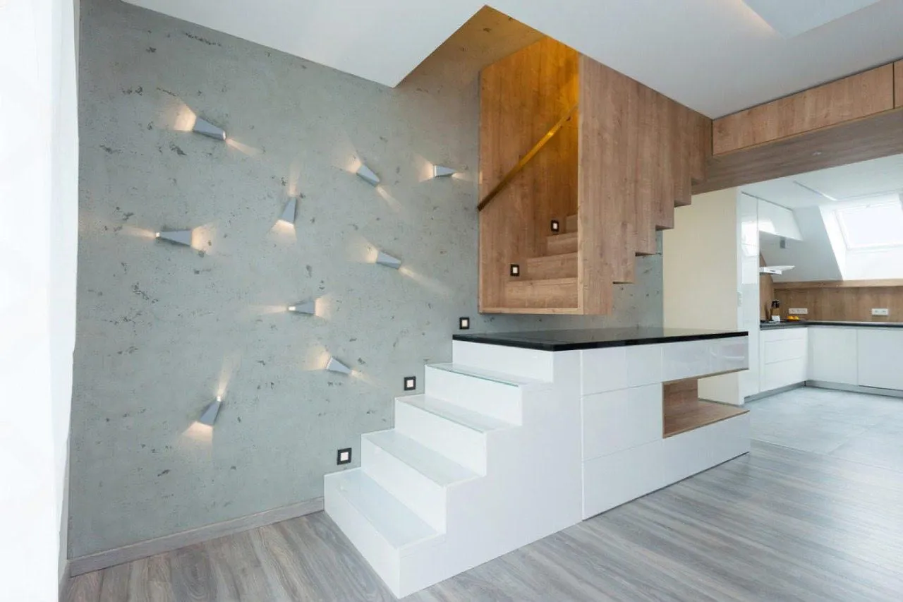 Идея для вашей лестницы: Усильте эффект «парящих» ступеней с помощью точечной подсветки, направленной на стену под каждой ступенью. Это создаст мягкое, рассеянное освещение и превратит лестницу в футуристический элемент интерьера в вечернее время.