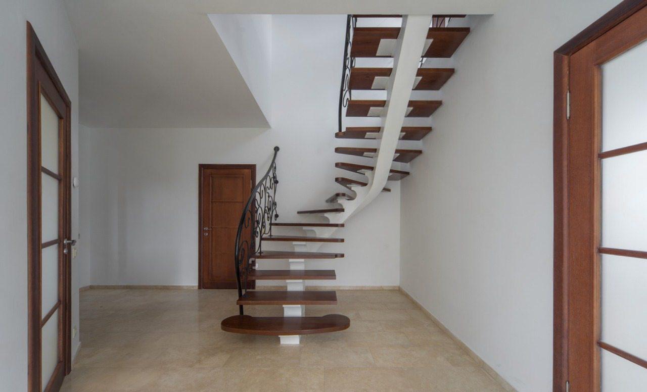 Основа композиции — белоснежный металлический монокосоур, который задает лестнице воздушный и динамичный силуэт. Мы изготовили для него ступени из цельного массива дуба, покрыв их прочным матовым лаком, который подчеркивает природную текстуру дерева. Особый шарм проекту придают лаконичные кованые перила черного цвета. Их изящные изогнутые линии, установленные в начале и конце марша, создают ощущение завершенности, не перегружая конструкцию.